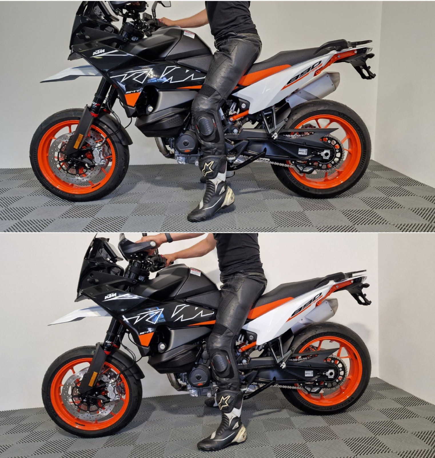 În cazul nostru, așa cum se vede în imagini, motociclistul a dorit să ajungă cu talpa complet pe sol, deoarece intenționează să parcurgă frecvent serpentine în munți, unde stabilitatea și controlul sunt esențiale. Astfel, a montat un kit de coborâre pe noua sa motocicletă, reducând înălțimea suspensiei cu 30 mm. Această ajustare i-a oferit mai multă încredere și siguranță în timpul condusului, oferindu-i un control superior, mai ales în curbele strânse ale drumurilor montane.