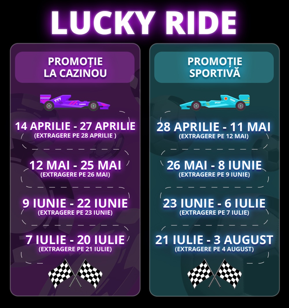 Simplu și direct. Dacă ești pasionat de jocuri de cazinou și sport, șansele tale de a pune mâna pe premiul cel mare cresc considerabil. Pentru amatorii de jocuri de cazinou, lucrurile sunt clare: folosește codurile speciale puse la dispoziție periodic în cadrul campaniei noastre Lucky Ride Promo și participă la extragerile lunare. Un mic secret: cu fiecare depunere de 125 RON, primești automat 25 de Free Spins și îți rezervi un loc pe lista scurtă pentru marele premiu.