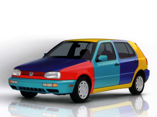 VW Golf Harlequin (1996) a fost o idee interesantă de marketing: pur şi simplu aceste maşini aveau panouri de caroserie vopsite diferit, rezultatul fiind o… maşină-clovn. Culorile disponibile erau albastru Chagall, galben Ginster, verde Pistachio şi roşu Tornado.