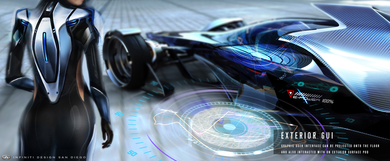 Pe lângă interfaţa om-maşină, conceptul Infiniti Synaptiq oferă trei opţiuni de carapace protectoare: una care se aseamănă foarte mult cu monoposturile de Formula 1 ale momentului, una pentru distracţie pe dunele de nisip şi una care poate să zboare.