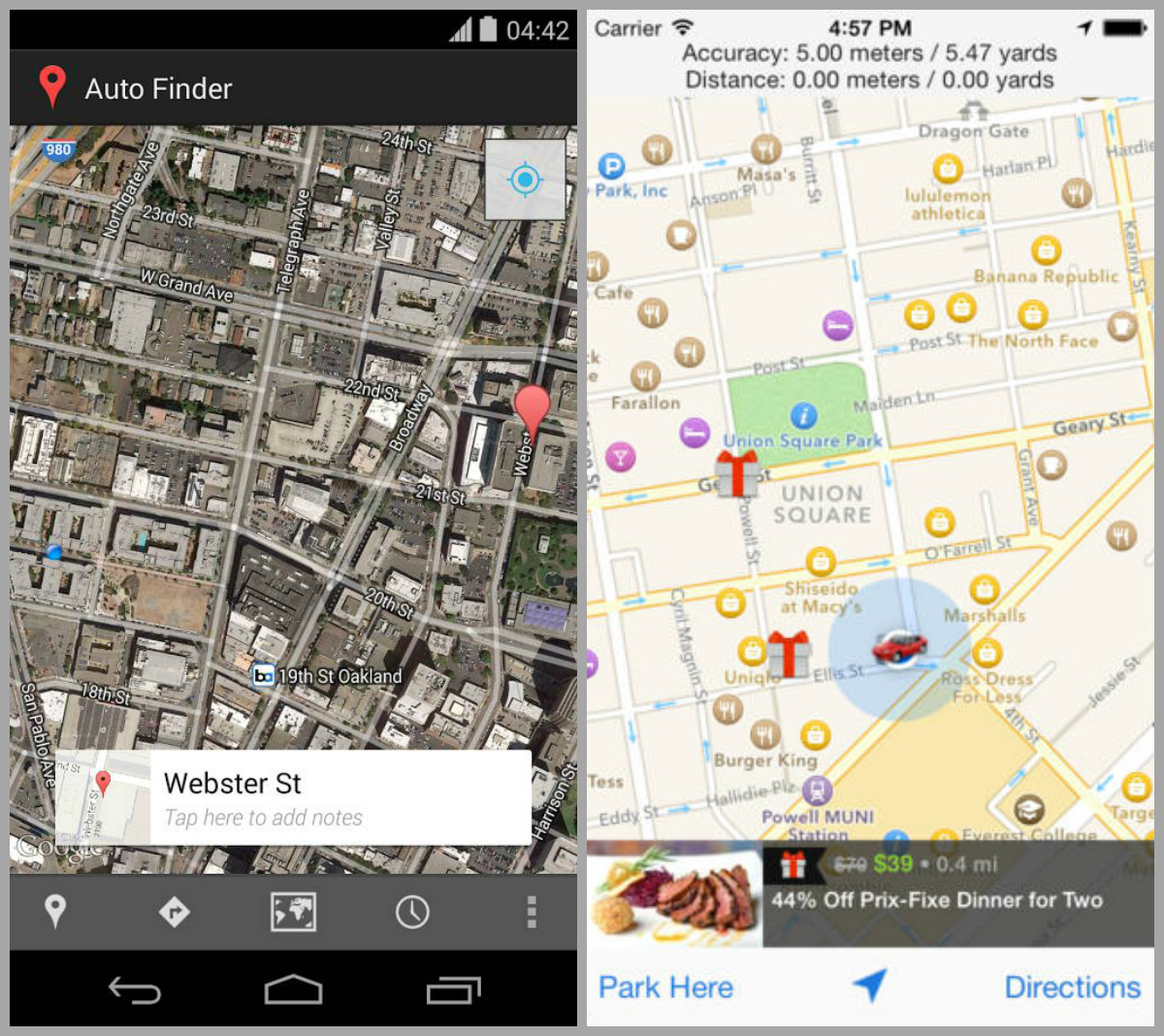 Auto Finder pentru Android (stânga) şi Take me to my car pentru iPhone (dreapta)