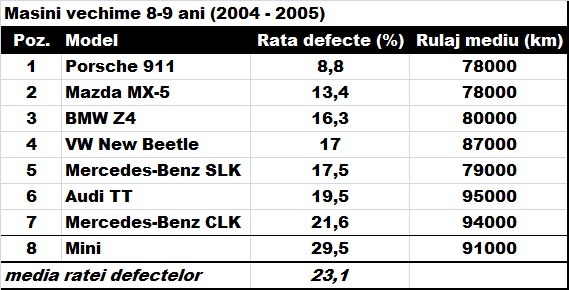 Porsche 911 (generaţia 996, prima cu motorul răcit cu apă) continuă să rămână modelul sport cu cea mai mică rată a defecţiunilor şi în cazul acestei categorii de vechime, situaţie valabilă, din nou surprinzător, şi în clasamentul general al maşinilor între 8 şi 9 ani.