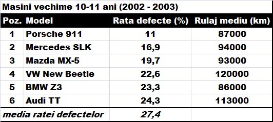 Numărul modelelor din această statistică este mult mai mic, dar foarte important este că ratele defecţiunilor se situează sub media generală. Mercedes-Benz SLK (prima generaţie) stă mai bine decât japonezul mai ieftin Mazda MX-5 (a doua generaţie).