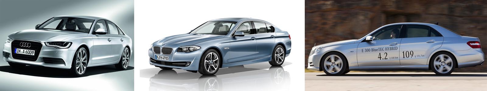 Variantele eco: Audi A6 Hybrid (245 CP, 6,2 litri/100 km), BMW ActiveHybrid 5 (340 CP, 6,4 litri/100 km), Mercedes-Benz E 300 HYBRID (231 CP, 4,2 litri/100 km)