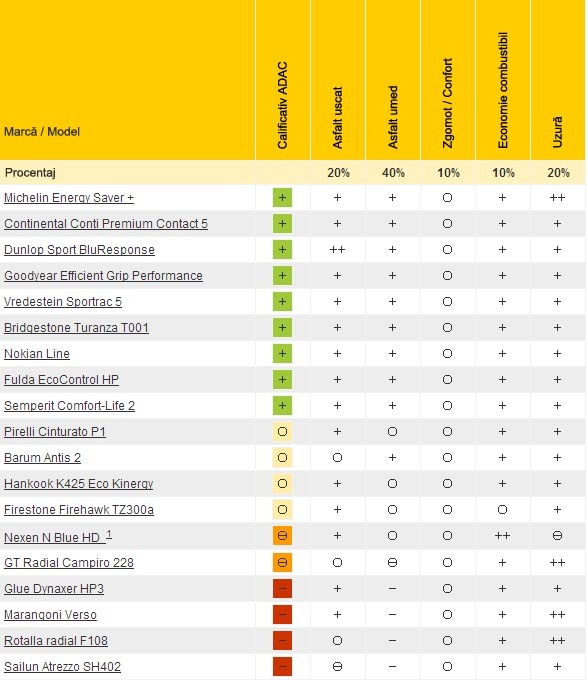 Michelin Energy Saver+ se evidenţiază datorită celei mai bune economii de combustibil pe care o conferă maşinii, în timp ce Continental Premium Contact 5 se detaşează prin manevrabilitatea excelentă. Dunlop Sport BlueResponse şi Goodyear Efficient Grip stau foarte bine la comportamentul pe asfalt umed, anvelopa Dunlop având şi cele mai bune rezultate la frânarea pe uscat.
