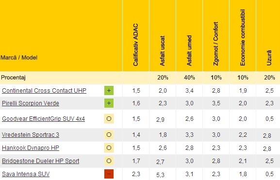 Cel mai bun calificativ îl primesc pneurile Continental Cross Contact UHP şi Pirelli Scorpion Verde, cu rezultatele cele mai bune în ce priveşte siguranţa atât pe carosabil uscat, cât şi pe carosabil ud.