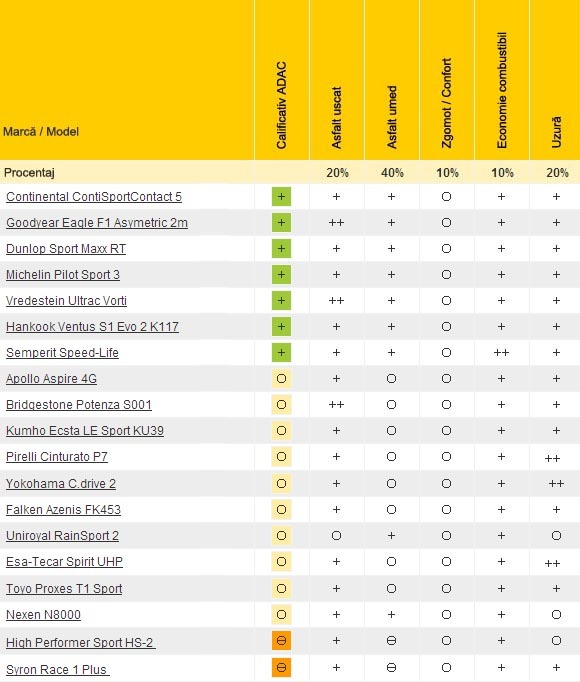 Specialiştii ADAC au acordat cele mai multe puncte pneurilor Continental ContiSportContact 5 (cele mai bune rezultate pe carosabil ud) şi Goodyear Eagle F1 Asymetric 2 (care excelează ca şi performanţe dinamice pe asfalt uscat).
