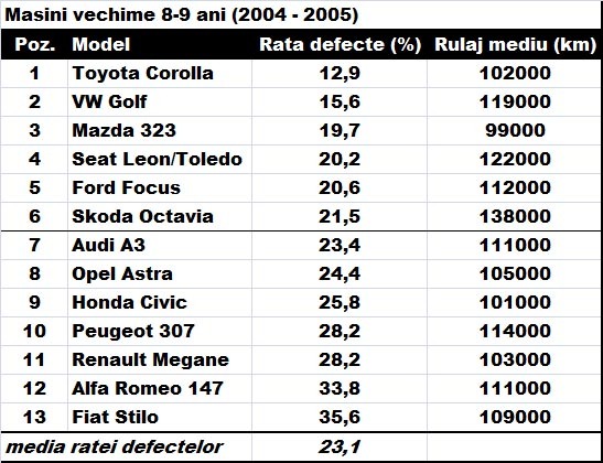 Italienii şi francezii rămân, şi de această dată, la finalul clasamentului, în timp ce Honda Civic şi Opel Astra conduc plutonul din a doua jumătate, cu procente relativ ridicate ale ratei defecţiunilor constatate.