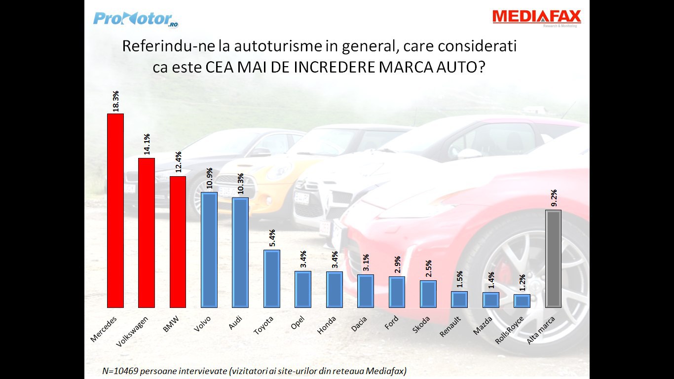 La întrebarea „Care este cea mai de încredere marcă auto?”, cei 10.469 de respondenţi au revenit la sentimente mai bune faţă de mărcile germane, acestea ocupând integral podiumul. Această întrebare diferă de cele precedente prin aceea că respondenţii nu şi-au mai notat maşina personală, ci au indicat o singură marcă considerată a fi „cea mai de încredere”. Rezultatele sunt după cum urmează: