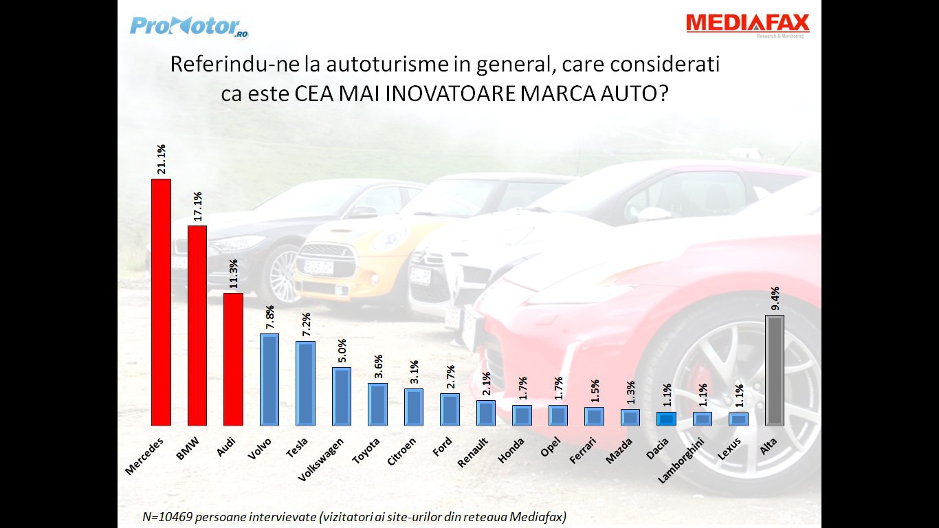 Surprinde plăcut prezenţa unei mărci puţin prezente în România, dar extrem de inovatoare în top 5. Votanţii au putut specifica, şi de această dată, o singură marcă drept răspuns la întrebarea „Care e cea mai inovatoare marcă auto?”