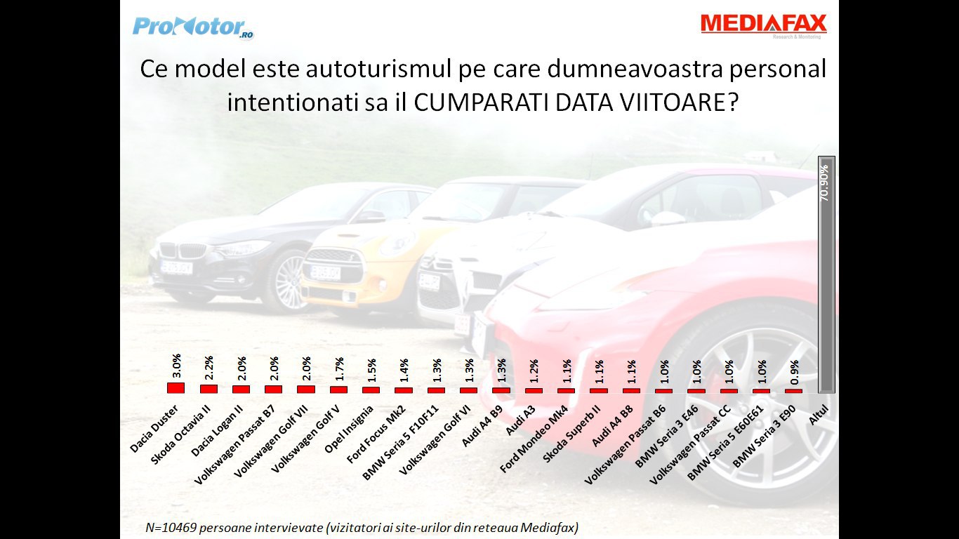 Deşi peste 40% dintre respondenţi indicaseră că doresc să cumpere o marcă premium, cel mai căutat model este unul autohton. De asemenea, modelele premium apar doar în partea de mijloc a clasamentului, la întrebarea „ce model este autoturismul pe care intenţionaţi să-l cumpăraţi data viitoare?”. Multe modele sunt, de fapt, second-hand.