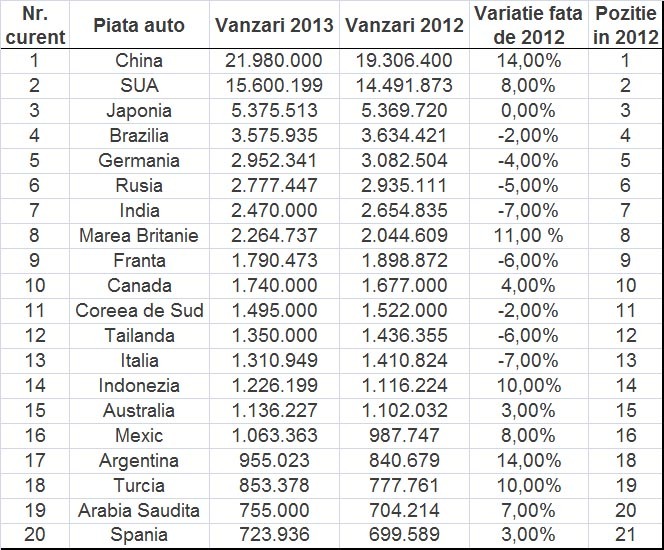 Spania e pe ultimul loc în acest TOP 20, dar nu într-o măsură aşa mare datorită creşterii uşoare a vânzărilor, ci mai mult din cauză că Iranul a suferit în 2013 o scădere masivă a vânzărilor de maşini noi (-28%), pe fondul interdicţiilor impuse de Naţiunile Unite.