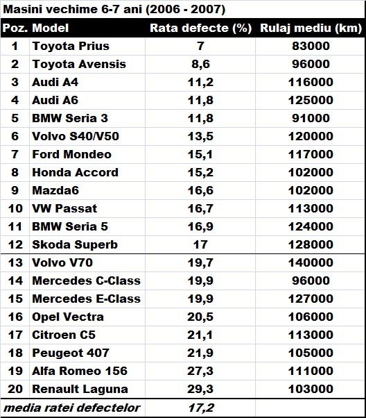 Din nou, hibridul japonez Toyota Prius reuşeşte să surprindă plăcut, ocupând prima poziţie a categoriei de vechime între 6 şi 7 ani, urmat fiind tot de un model Toyota: Avensis.
