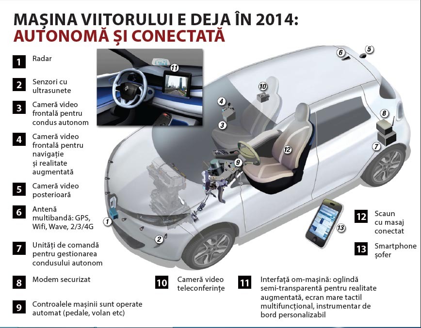 Toate aceste sisteme există deja în opţiune, dar ele vor deveni treptat un standard în materie de siguranţă. Da, inclusiv Loganul viitor va avea încorporate cel puţin o parte din aceste sisteme până în 2020, în măsura în care ele vor deveni obligatorii prin lege. Costurile suplimentare – mari astăzi – vor fi acoperite prin amortizarea investiţiei datorată adoptării pe scară largă a noilor tehnologii, astfel încât preţul final al maşinii nu va creşte cu mai mult de 10% pentru a putea cuprinde toate aceste sisteme ale maşinilor – le putem spune deja aşa – semiautonome. Un rol la fel de important îl vor juca sistemele de comunicare între maşină şi şofer, dar şi între maşini. Astfel, în momentul în care în faţă are loc un ambuteiaj sau un accident, sistemul de navigaţie primeşte informaţia de la celelalte maşini şi recalculează cea mai bună rută.