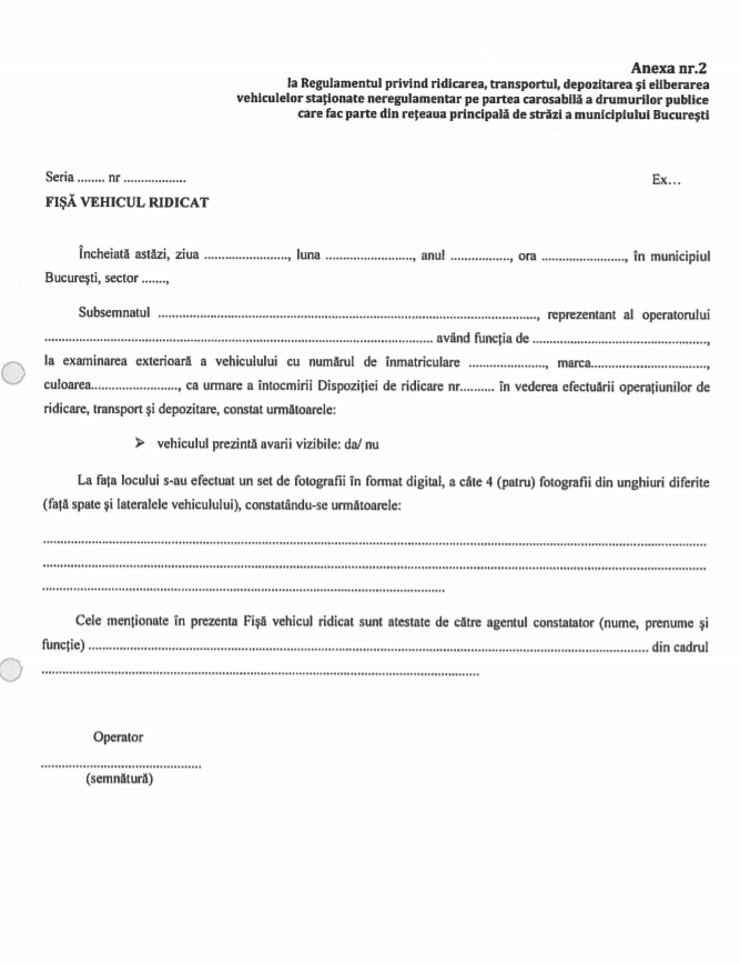 Înainte de ridicare, agentul constatator va fotografia vehiculul şi va completa fişa privind starea vehiculului.