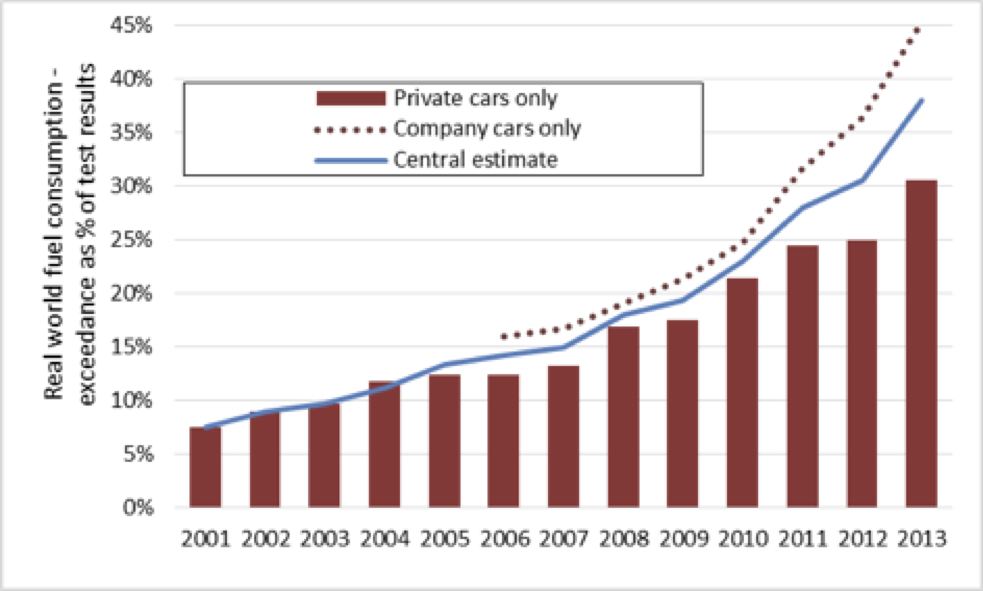 În ceea ce ţine de diferenţa (în Europa) dintre consumul real şi cel declarat, aceasta s-a mărit considerabil în 12 ani – dacă în 2001 diferenţa era de circa 8%, în 2013 s-a ajuns şi la un procent de 31% între ceea ce declară producătorii şi cât consumă, în realitate, un anumit model. Desigur, media este generalistă, cuprinzând toate modelele şi toate motorizările din gama producătorului. În cazul maşinilor de flotă, procentul ajunge şi la 43%.