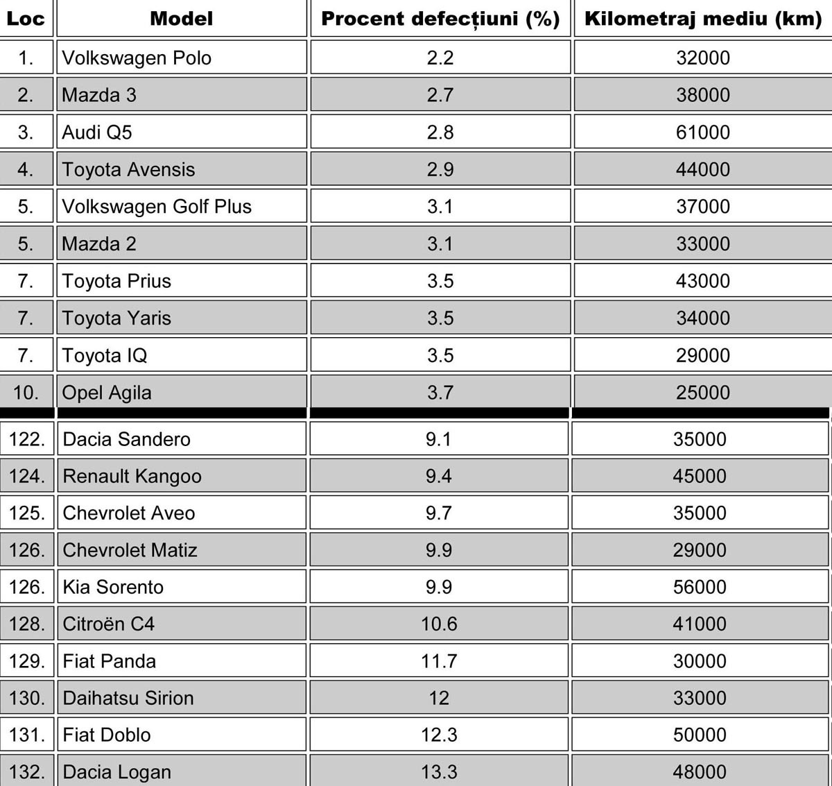 La polul opus, în TOP 10 al modelelor cu cele mai multe probleme (adică un procent mare al defecţiunilor) remarcăm prezenţa a două modele Dacia: Sandero (9,1%) şi Logan (pe ultimul loc, cu 13,3%). De altfel, în ciuda faptului că modelele Dacia sunt considerate ca având un bun raport preţ/fiabilitate, Logan s-a regăsit pe ultima poziţie şi în cazul TÜV Report 2012, atunci având un procent de 12,5%.