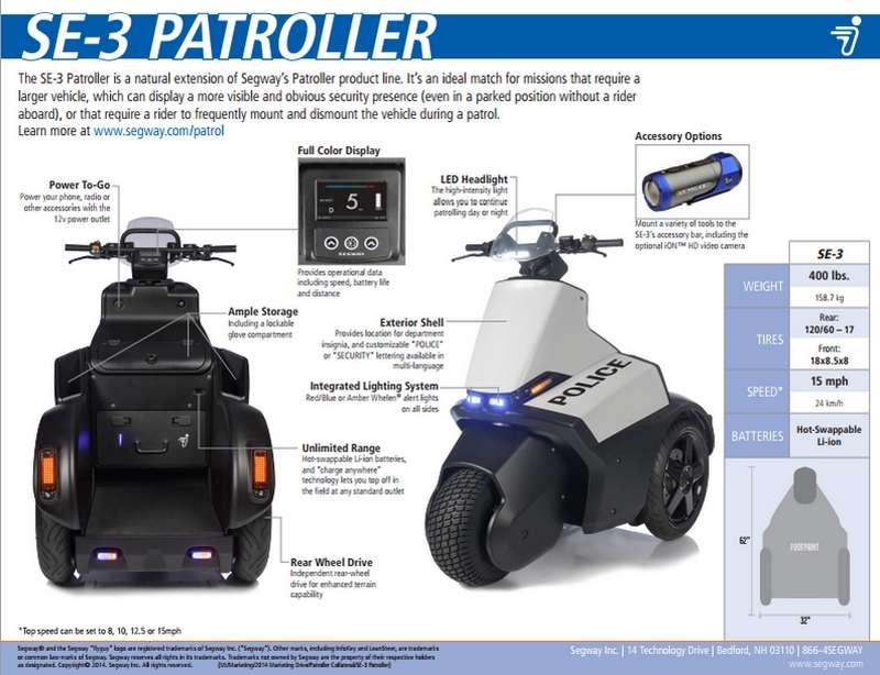 Dar iată că oficialii Segway consideră că există şi situaţii care necesită un vehicul mai bun. Iar acesta este noul Segway SE-3 Patroller, care are trei roţi (deci nu mai are nevoie de sistemul de auto-echilibrare). Beneficiind de o mai bună stabilitate şi de o platformă situată la înălţime mai mare, SE-3 Patroller asigură în primul rând o vizibilitate mai bună, fiind un punct de observaţie superior.