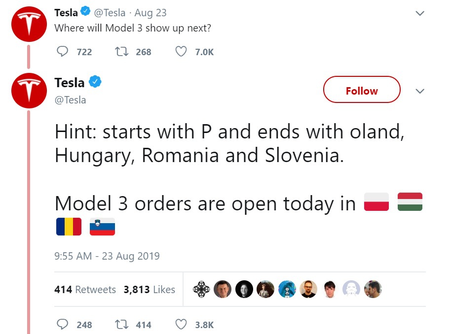 Compania americană Tesla a anunţat pe pagina de Twitter că Model 3 pot fi comandat în Polonia, România, Polonia, Ungaria şi Slovenia. Pe lângă Model 3 mai sunt disponibile şi Model S şi Model X, se arată într-o postare ulteriorară.