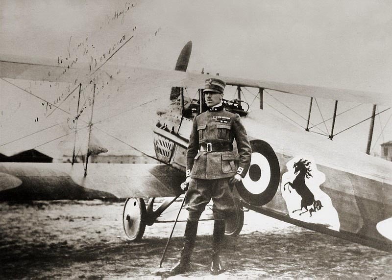 Ok, veţi spune, şi care-i legătura cu Ferrari şi Porsche? Well, neamţul avea pe avion simbolul oraşului Stuttgart, adică un căluţ negru cabrat… Şi uite aşa, pe lângă cocardele tricolore, avionul italianului, un Nieuport 11 poreclit ”Bebe”, s-a mai pricopsit si cu o emblemă neagră (care da, a purtat ghinion).