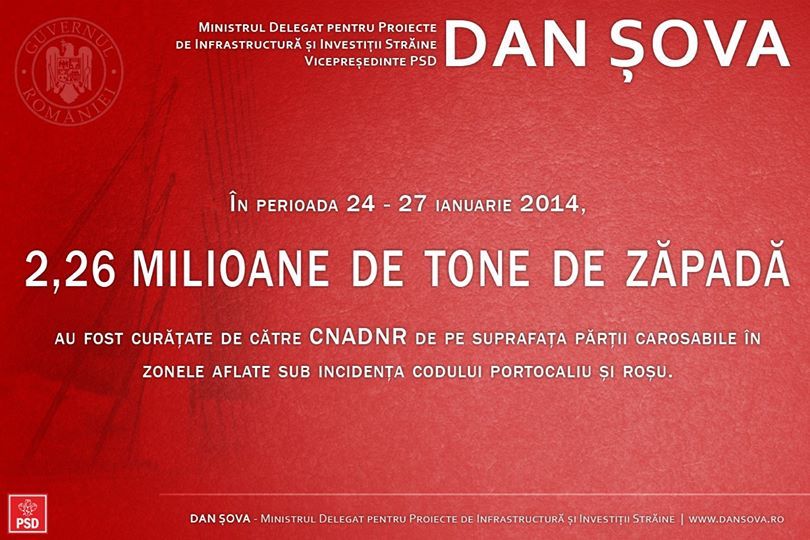 Însă a te lăuda, ca Ministru al marilor proiecte de infrastructură, că ai reuşit să dai zăpada, mi se pare ceva de domeniul lui Caragiale. Domnul Şova ar trebui să şovăiască mult şi bine înainte să se laude că a făcut ceea ce trebuia oricum să facă, iar cei care lucrează la departamentul de comunicare al domnului ministru ar trebui să-şi caute prin cămări, poate mai găsesc pe acolo pancartele comuniste cu realizărili la hectar!