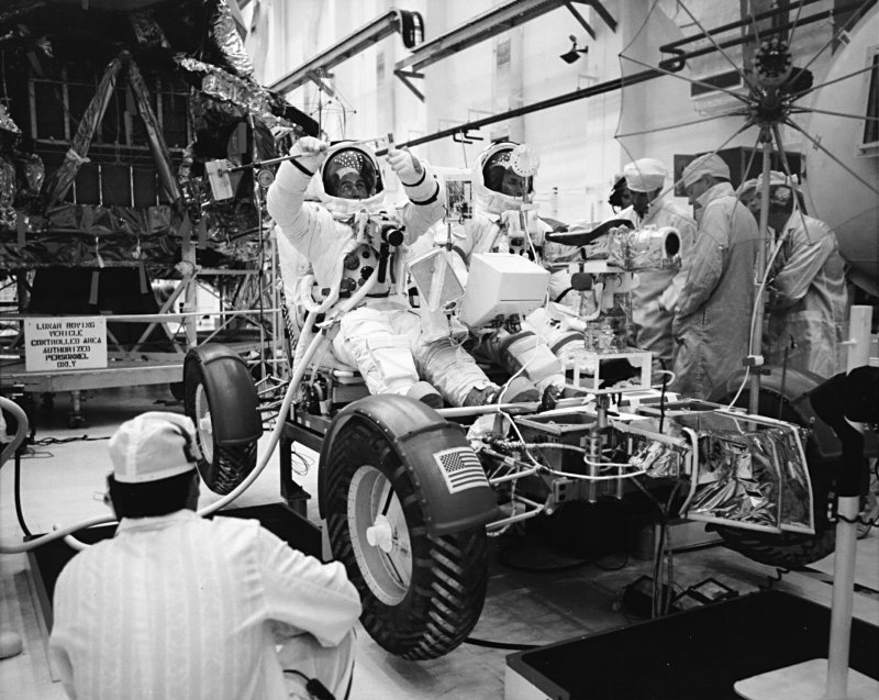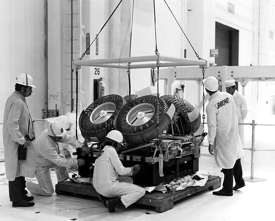Ingineri Boeing care pregătesc LRV de încărcare în modulul de aselenizare. O muncă inutilă dacă totul era o butaforie