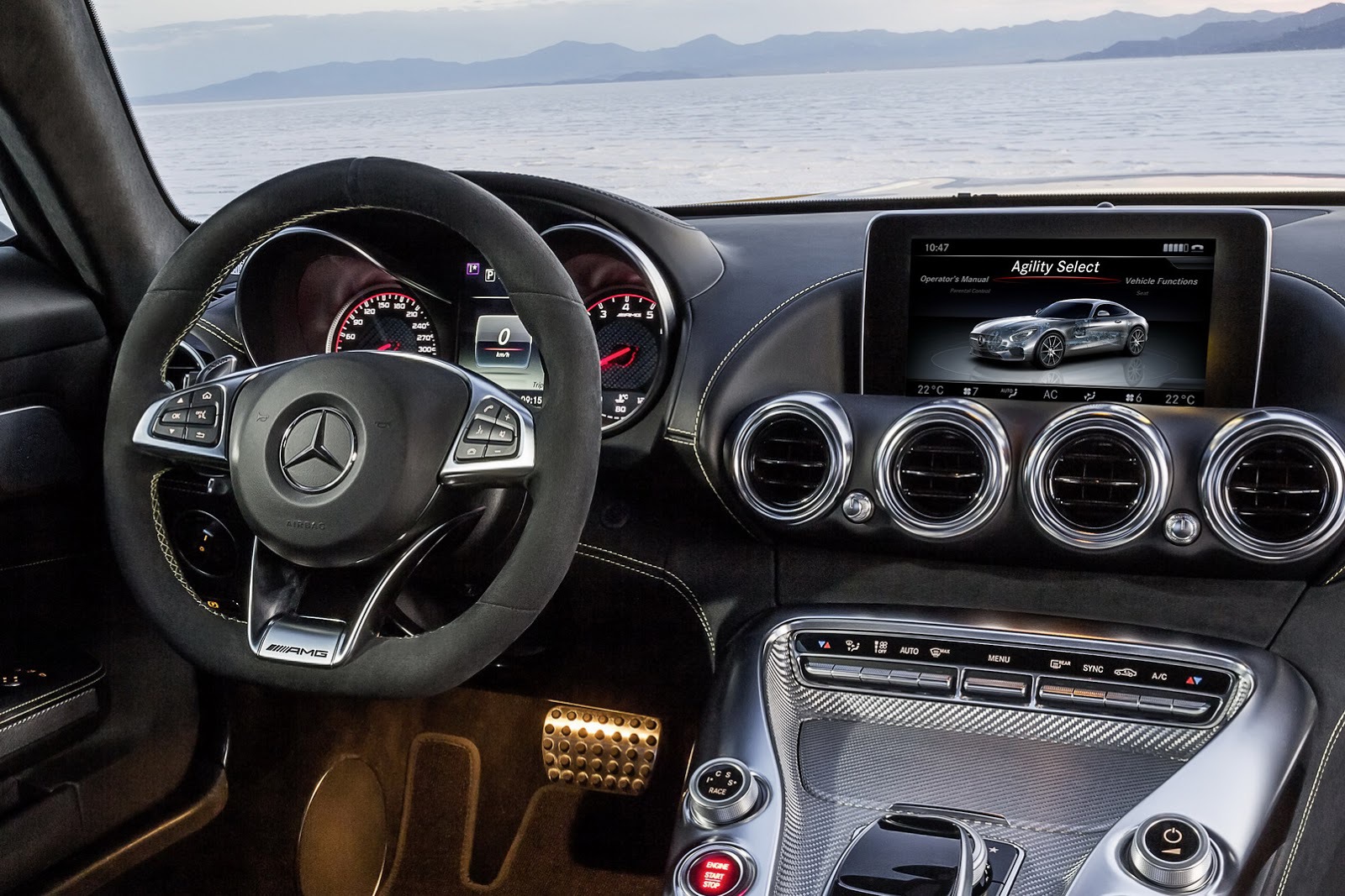 Despre aspectul exterior vorbesc cel mai bine imaginile din galeria foto, însă există câteva detalii despre habitaclul noului AMG GT ce merită punctate. Interiorul se prezintă într-o configuraţie cu două locuri, iar elementele de design sunt grefate de la celelalte modele de performanţă din gama oferită de Mercedes-Benz. Nu lipsesc materiale de calitate, conform standardului Mercedes-Benz, precum pielea şi fibra de carbon.