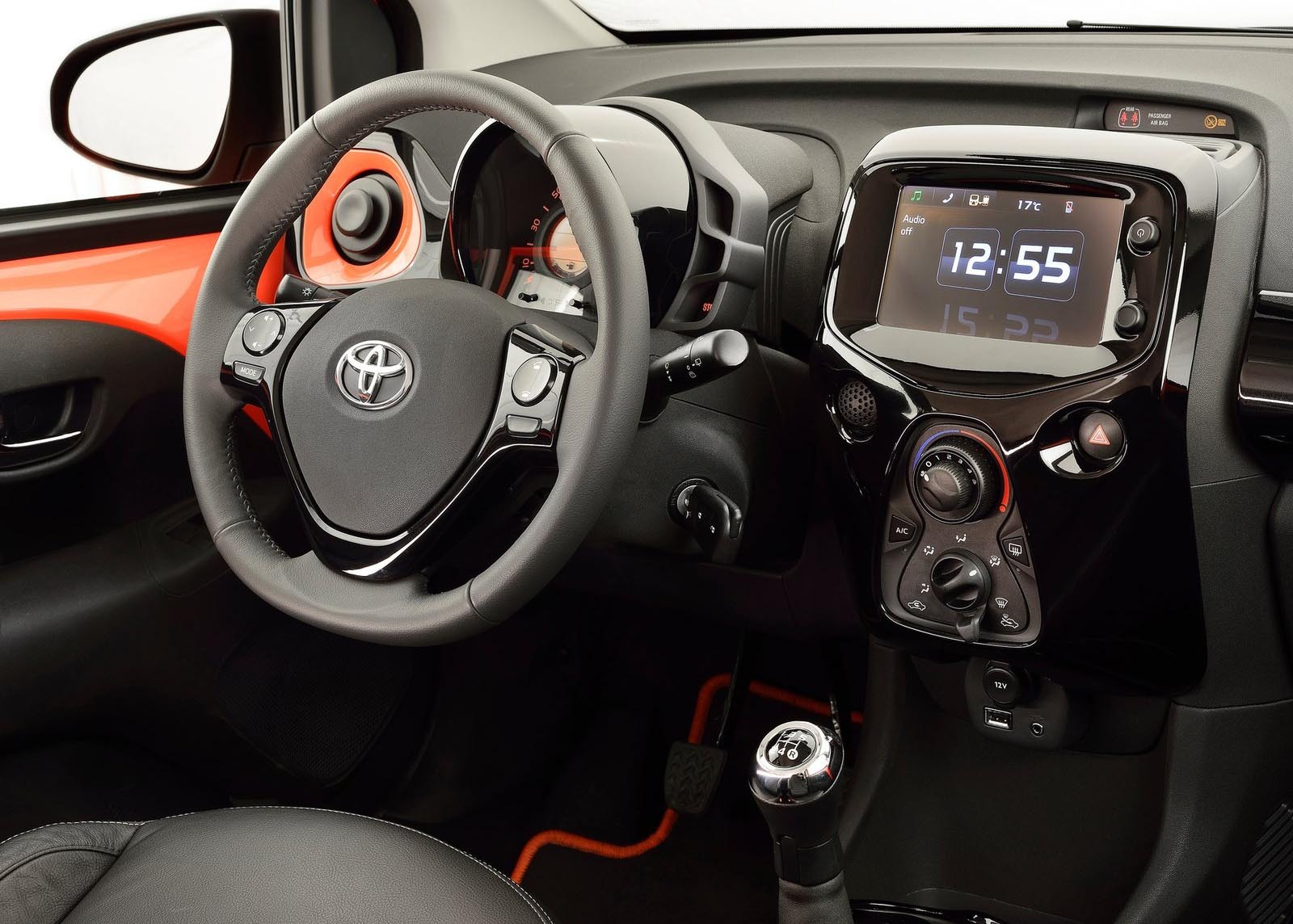 Interiorul este dominat de sistemul multimedia botezat x-touch, cu un display de 7 inci şi conectare online MirrorLink. În rest, mizează pe simplitate, nu doar din raţiuni de costuri cât mai scăzute, ci şi pentru a oferi un spaţiu interior cât mai mare dată fiind lungimea de 3,5 metri (ampatamentul a rămas acelaşi, dar noua Aygo e mai spaţioasă).