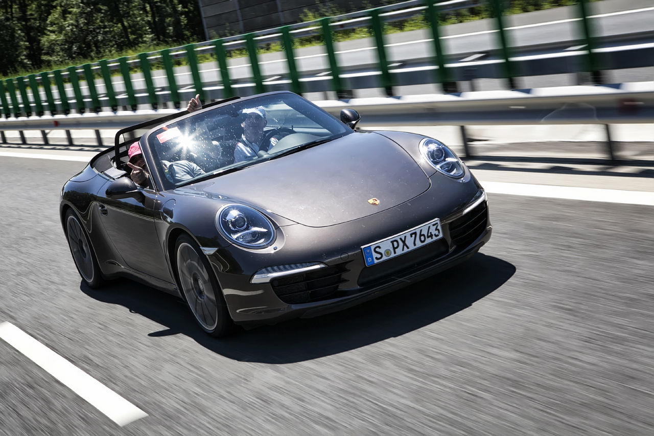 Sari apoi într-un Carrera Cabrio 4S pe locul pasagerului din dreapta şi chicoteşti în timp ce jurnalistul auto de lângă tine încearcă să-i destabilizeze fundul pe serpentinele dinspre Râşnov – ai încercat şi tu asta la Cercul Polar, pe gheaţă, şi ştii cât de greu este să faci maşina asta să derapeze. Pur şi simplu, sistemul de tracţiune integrală al Carrerei 4S te va ţine pe drum indiferent ce vei încerca să faci tu cu spatele maşinii – va trebui să-ţi învingi complet sistemele de siguranţă din creier pentru a reuşi un drift, iar drumurile publice nu sunt potrivite pentru asta… În schimb, succesiunile de viraje pot fi abordate extrem de tare cu 4S-ul, fără niciun stress: maşina e permanent lipită de asfalt, şoferul rânjeşte demonic, iar tu ca pasager rămâi liniştit şi fără rinichi rupţi, pentru că acelaşi şasiu care vorbeşte cu şoferul îţi lasă ţie spatele să se relaxeze.