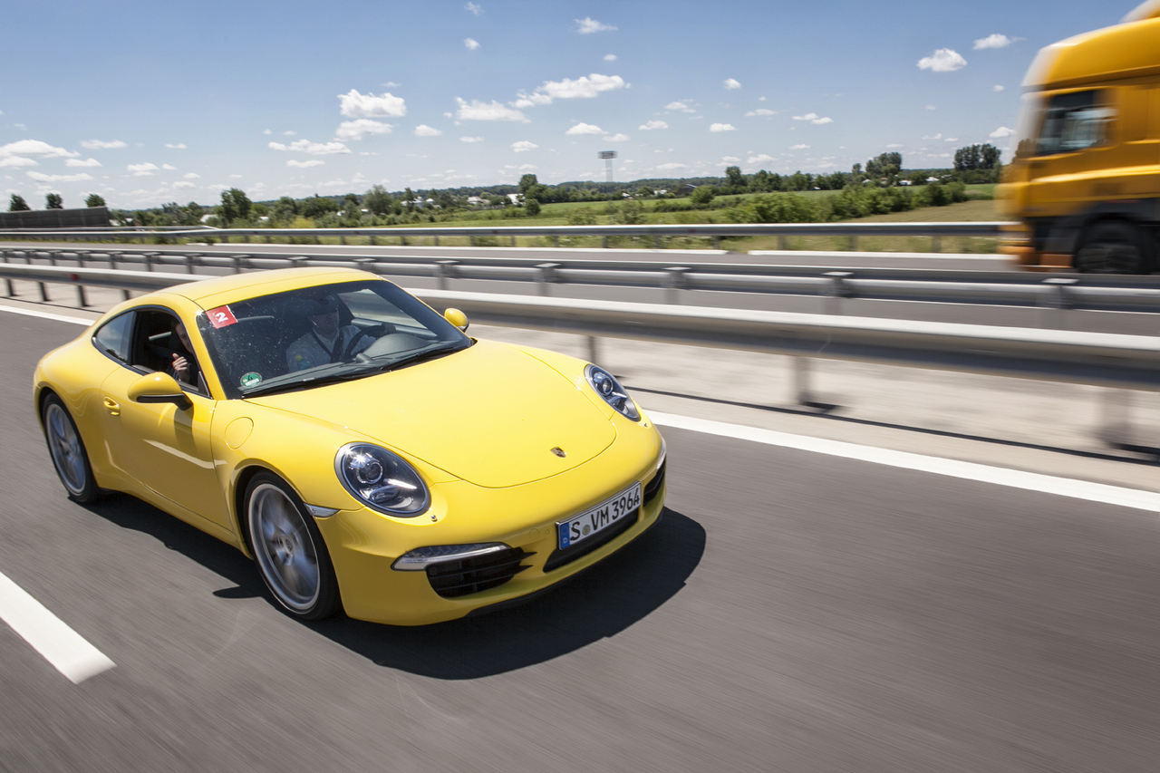 Sau, mai bine spus, pleci agale într-o coloană de 22 de Porsche-uri de toate culorile şi mărimile, făcând senzaţie în toată Pipera (poate cu această ocazie s-au şi încruntat nişte sprâncene şi dat nişte telefoane de comandă…). Iar dacă la început te afli chiar într-un Carrera S, te bucuri de faptul că nu mai este la fel de nervos ca pe vremuri – puriştii vor comenta supăraţi în barbă, însă realitatea este că în traficul aglomerat numai de o maşină care să-ţi sară cu cei 400 de CP ai săi de sub picioare nu ai nevoie. Bestia toarce liniştit din motorul său boxer de 3.8 litri, dar imediat ce ai ieşit pe autostrada Bucureşti-Ploieşti iar instructorii aflaţi în faţa caravanei îţi dau verde, pricepi de ce sunt în stare cei 440Nm puşi integral pe puntea spate, căci eşti împins înainte într-un răget încântător al motorului, iar viteza devine aproape instantaneu ilegală.