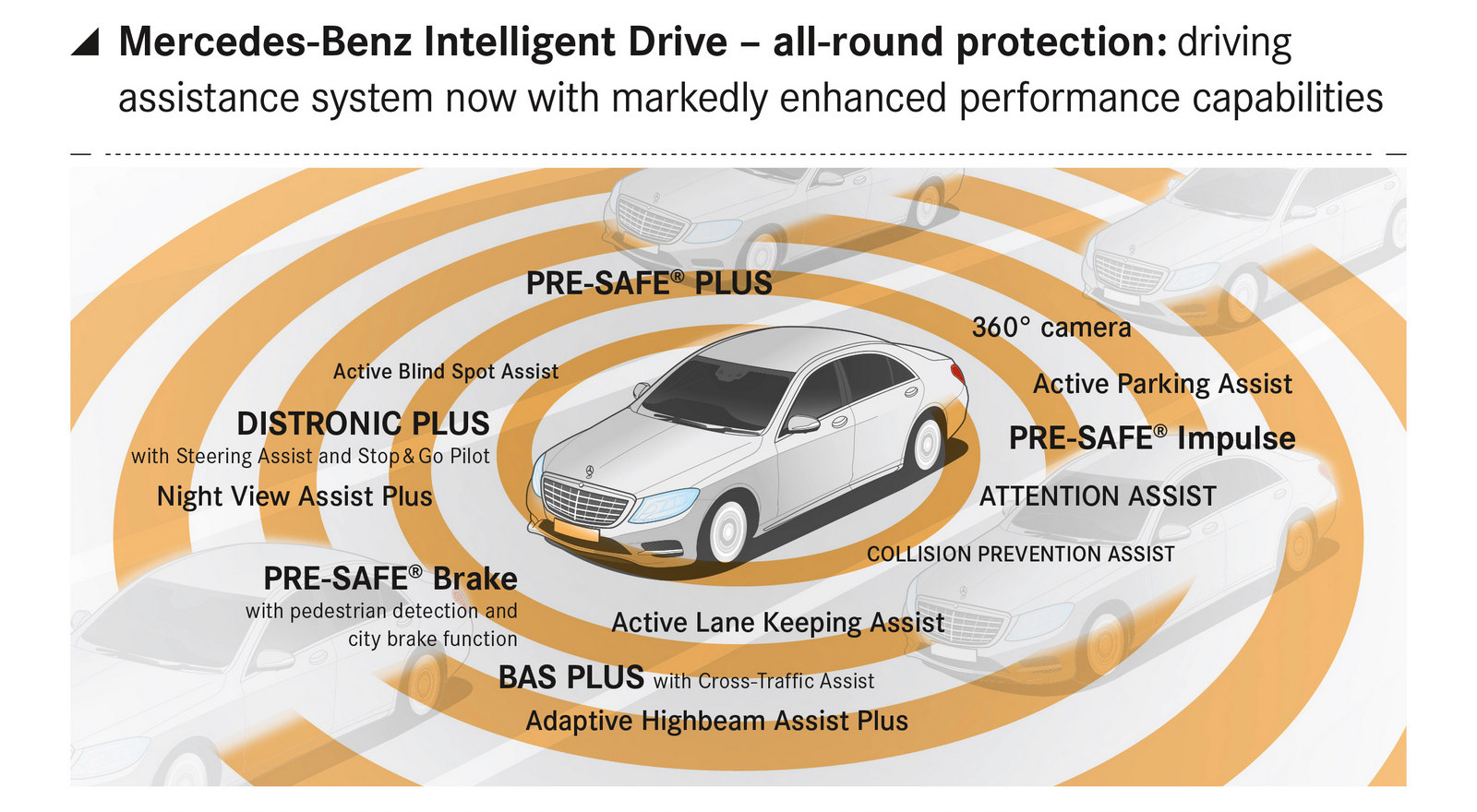 Multe dintre sistemele de asistenţă de pe noul S-Class funcţionează în acest fel, adunând date din mai multe surse pentru a ajunge la un rezultat fiabil.