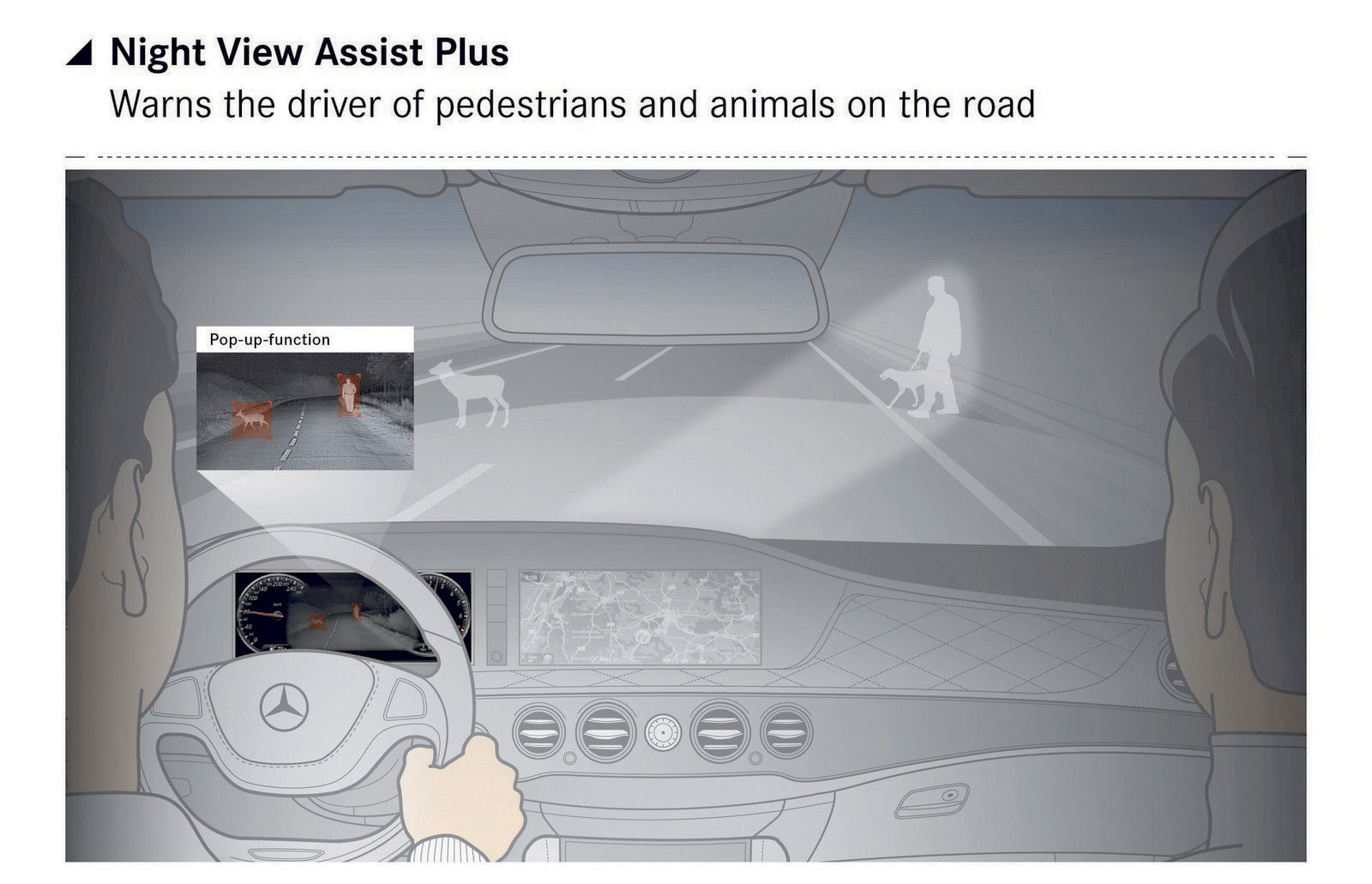 De ce ai avea nevoie de infraroşii? Ei, bine, pentru ca şoferul să aibă parte de o imagine mult mai edificatoare atunci când rulează noaptea pe un drum neiluminat. Pe ecranul din spatele volanului apar imaginile video furnizate de două camere video cu infraroşii, care detectează oameni şi animale pentru a avertiza şoferul de prezenţa lor. Mai mult, una dintre cele două camere cu infraroşii este capabilă să ofere date despre temperatura obiectelor din faţă, iar un modul special încorporat în blocurile optice îi avertizează pe pietoni de apropierea maşinii.