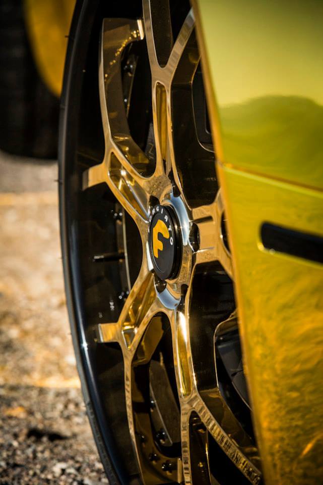 Pe lângă folia cu look de aur, care îmbracă toată caroseria maşinii, maşina de faţă se laudă şi cu un set de jante Forgiato, ale căror spiţe sunt şi ele finisate tot în stil gold.