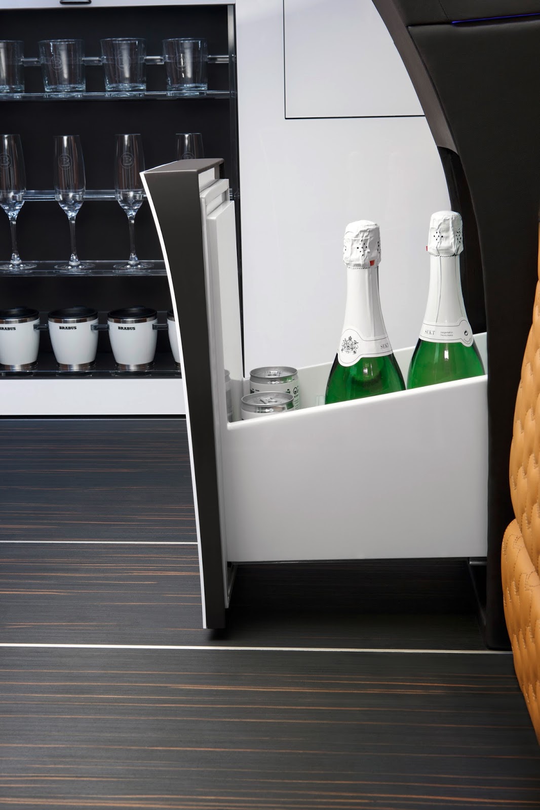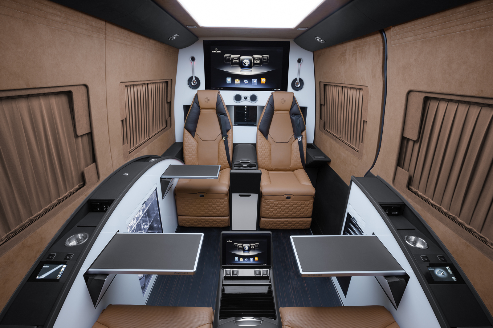 În total, Brabus Business Lounge (căci acesta e numele dat utilitarei Mercedes) are opt scaune dispuse pe patru rânduri. Fotoliile de pe ultimul rând sunt montate cu faţa înainte şi pot fi scoase dacă oamenii de afaceri care fac tranzacţii cu diamante au nevoie de mai mult spaţiu pentru bagajele pline cu bani gheaţă.