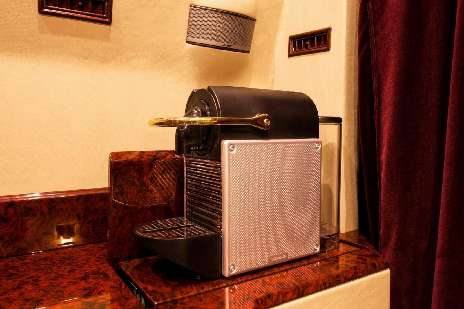 De ambianţă se ocupă sistemul de sonorizare Bose, iar musafirii pot fi serviţi cu o cafea din aparatul Nespresso placat cu aur sau cu o băutură rece din mini-frigiderul instalat în dubă.