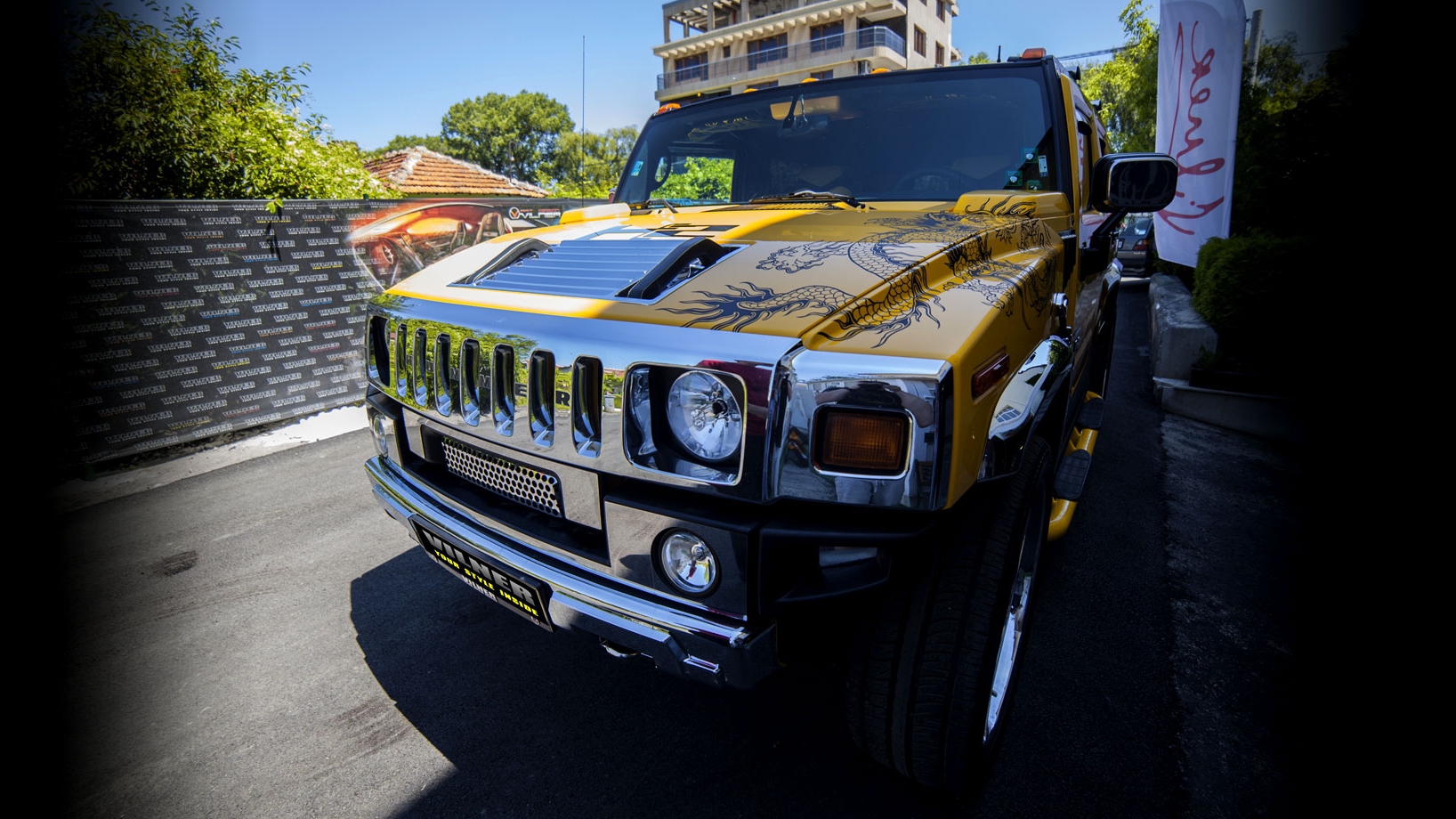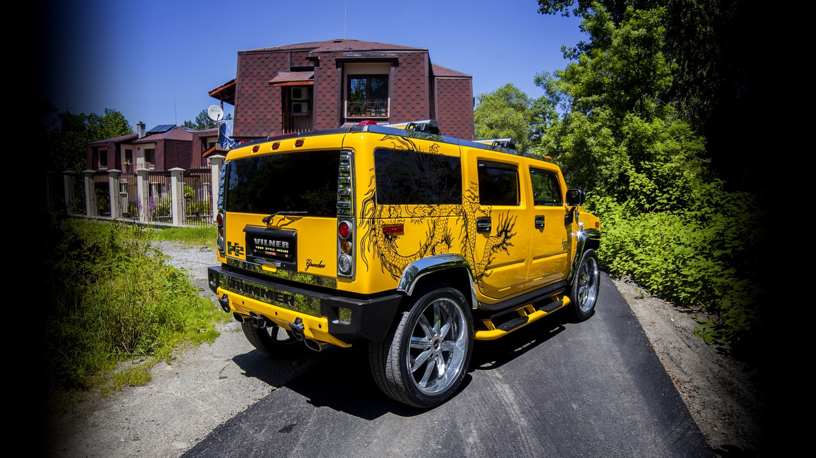 Ceea ce ne aduce cu discuţia la subiectul de astăzi, cel mai recent proiect al lor, Hummer H2. Privindu-l, aproape că îţi vine să râzi un pic de dinozaurul american pictat cu dragoni şi vopsit în galben strident. Şi cu jante cromate de 26 de inci.