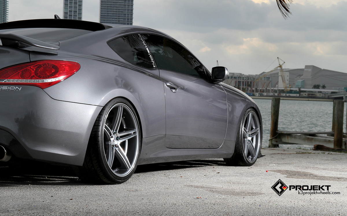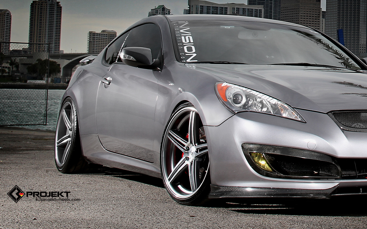 La exterior, Genesisul Coupe se laudă cu elemente de caroserie din fibră de carbon, un eleron deasupra lunetei şi un difuzor de aer în bara din spate. Tabloul e completat de jantele K3 Project F2, care măsoară 20×9 inci pe faţă şi 20×10,5 inci pe spate.