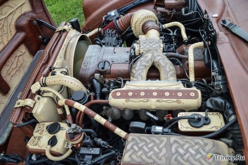 Şi tot nu am terminat: dacă prezenţa tapiţeriei din piele e oarecum normală în portbagaj, nu la fel putem spune despre ornamentele din piele din… compartimentul motor! Exact, obsesia creatorului a fost atât de mare încât multe dintre componentele de sub capotă au fost şi ele învelite în piele, deşi ne întrebăm dacă acest lucru nu e periculos, dat fiind riscul de incendiu cauzat de temperaturile ridicate în timpul mersului.
