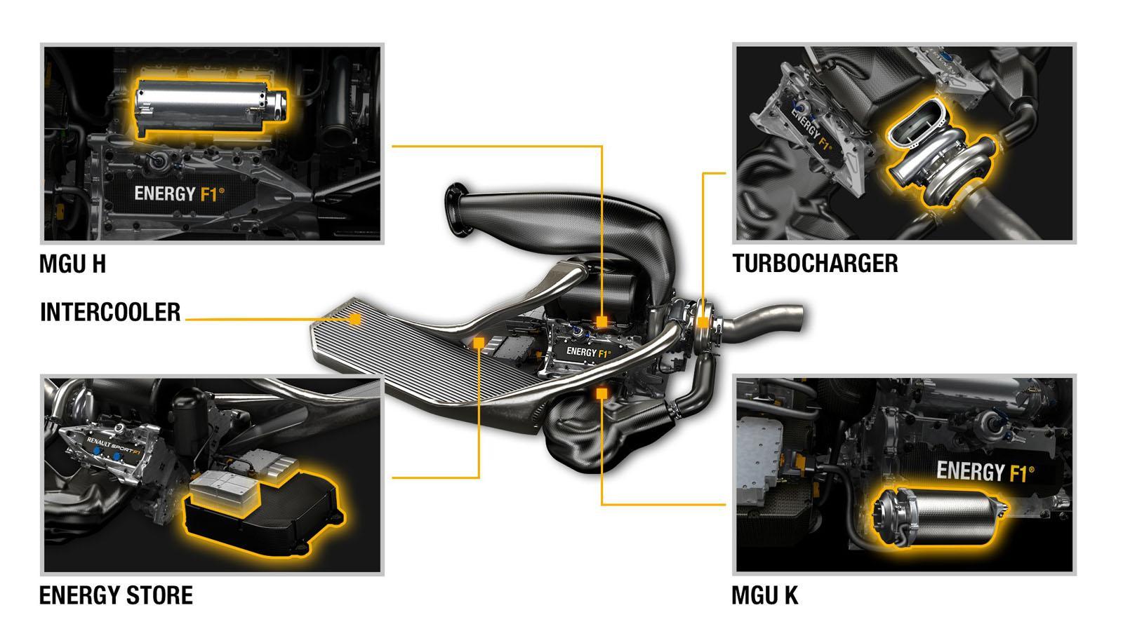 Micul turbo produce o putere maximă de circa 600 CP, fiind cu 150 CP mai puţin potent decât actualul V8 RenaultSport F1. Însă handicapul de putere este suplinit de sistemul MGU, care dezvoltă 120 kW (circa 160 CP) graţie unităţii MGU-K, conectată la arborele cotit şi care are şi rol de recuperare a energiei la frânare.