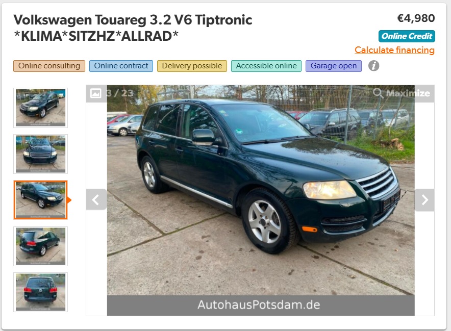 5. Volkswagen Touareg (2004) – motor benzină -rulaj 221.034 km – 4,980 de euro
