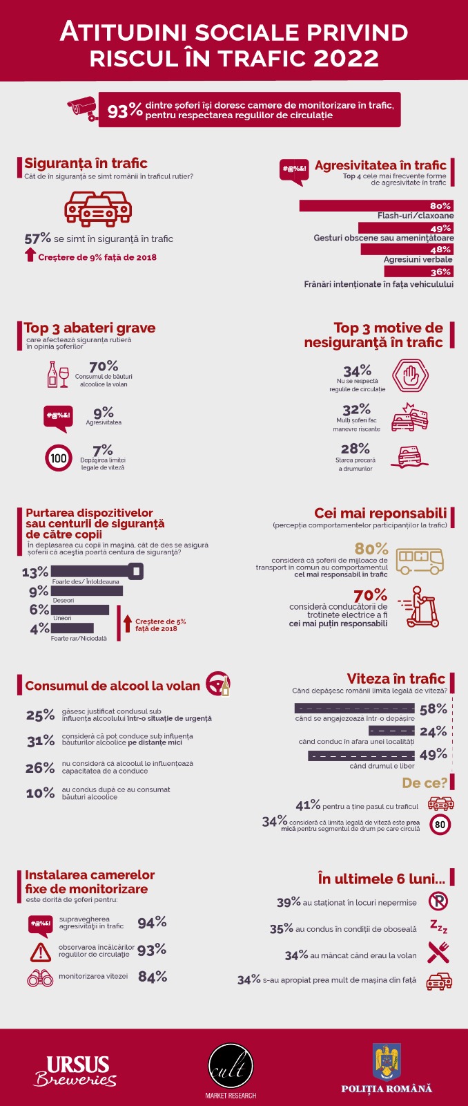 Studiul „Atitudini sociale privind riscul în trafic 2022” a fost realizat de Poliția Română și Ursus Breweries.