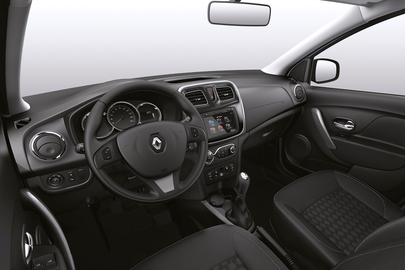 Setul de inserţii cromate este continuat la interior la nivelul consolei centrale redesenate, unde încadrează aeratoarele dreptunghiulare şi se alătură sistemului Media NAV. În rest, vorbim despre acelaşi design afişat de modelul Logan comercializat în ţara noastră, însă modelul ar putea primi suplimentar climatizare automată cu comenzi preluate de pe Renault Clio 4, geamuri electrice, senzori de parcare şi tapiţerie din piele.