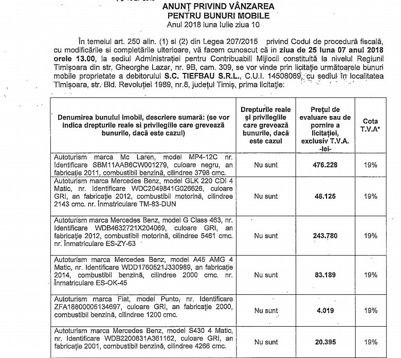 Lista continuă cu un autoturism Mercedes-Benz ML300, an fabricaţie 2011, la preţul de pornire al licitaţiei de 64.400 lei, un Mercedes-Benz G Class 463 care se vinde cu 244.000 de lei şi un Mercedes A45 AMG care are un preţ de start de 83.000 de lei.