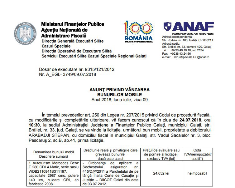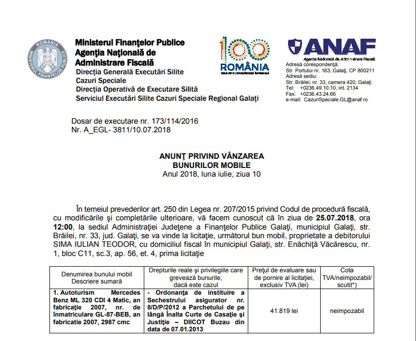 În data de 25.07.2018, ora 12:00, în municipiul Galaţi, strada Brăilei, nr. 33, etaj 4, camera 420, jud. Galaţi (sediul Administraţiei Judeţene a Finanţelor Publice Galaţi), licitaţie pentru autoturism Mercedes Benz ML 320 CDI 4 Matic, an fabricaţie 2007, nr. de înmatriculare GL-87-BEB, an fabricaţie 2007, 2987 cmc, preţul de pornire al licitaţiei este de 41.819 lei, exclusiv TVA.