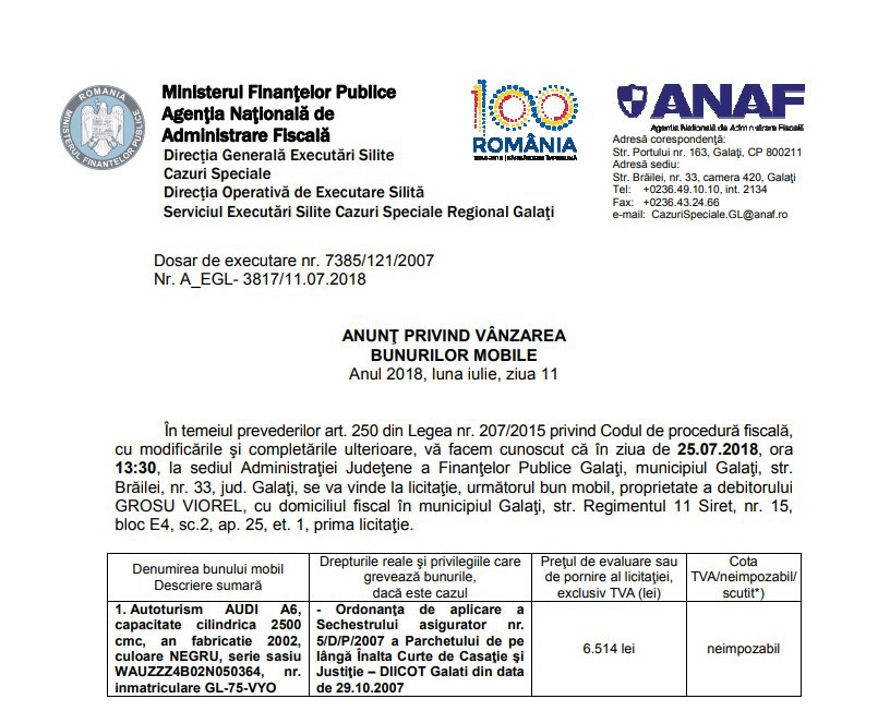 În data de 25.07.2018, ora 13:30, în municipiul Galaţi, strada Brăilei, nr. 33, etaj 4, camera 420, jud. Galaţi (sediul Administraţiei Judeţene a Finanţelor Publice Galaţi), licitaţie pentru autoturism AUDI A6, capacitate cilindrică 2500 cmc, an fabricaţie 2002, culoare NEGRU, serie şasiu WAUZZZ4B02N050364, nr. înmatriculare GL-75-VYO, preţul de pornire al licitaţiei este de 6.514 lei, exclusiv TVA.