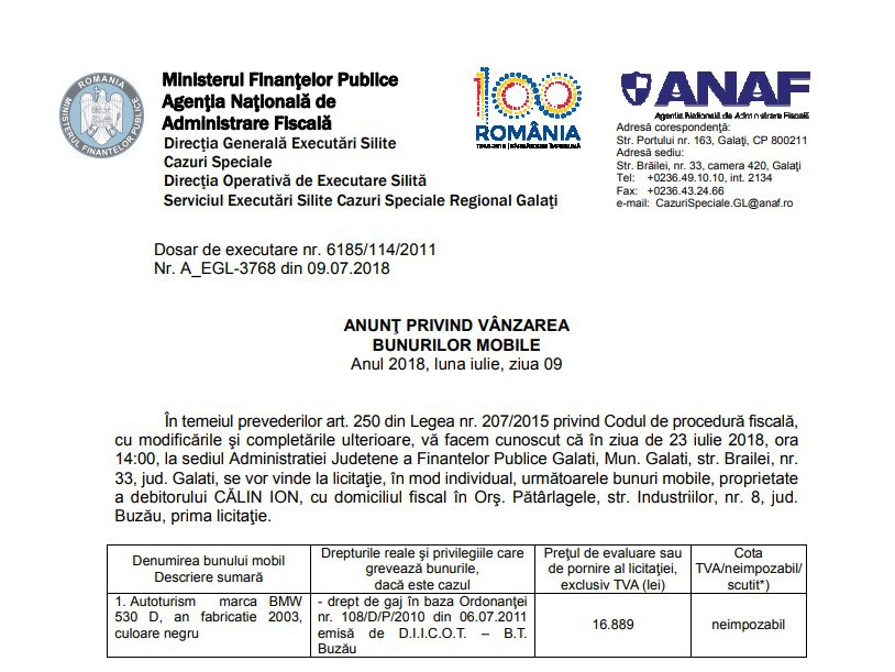 Tot în Galaţi se organizează în data de 23.07.2017, ora 14:00, strada Brăilei, nr. 33, etaj 4, camera 420, jud. Galaţi (sediul Administraţiei Judeţene a Finanţelor Publice Galaţi), prima licitaţie pentru autoturism marca BMW 530 D, an fabricaţie 2003, culoare negru, preţ de pornire al licitaţiei 16.889 lei, exclusiv TVA, în scopul recuperării creanţelor bugetare stabilite prin hotărâre judecătorească pronunţată în materie penală, în dosarul nr. 6185/114/2011.
