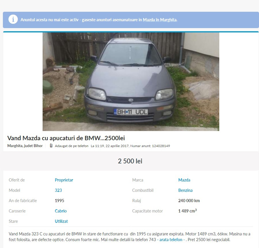„Vând Mazda 323 C cu apucături de BMW în stare de funcţionare … din 1995 cu asigurare expirată. Motor 1489 cm3, 66kw. Maşina nu a fost folosită, are defecte optice. Consum foarte mic.”