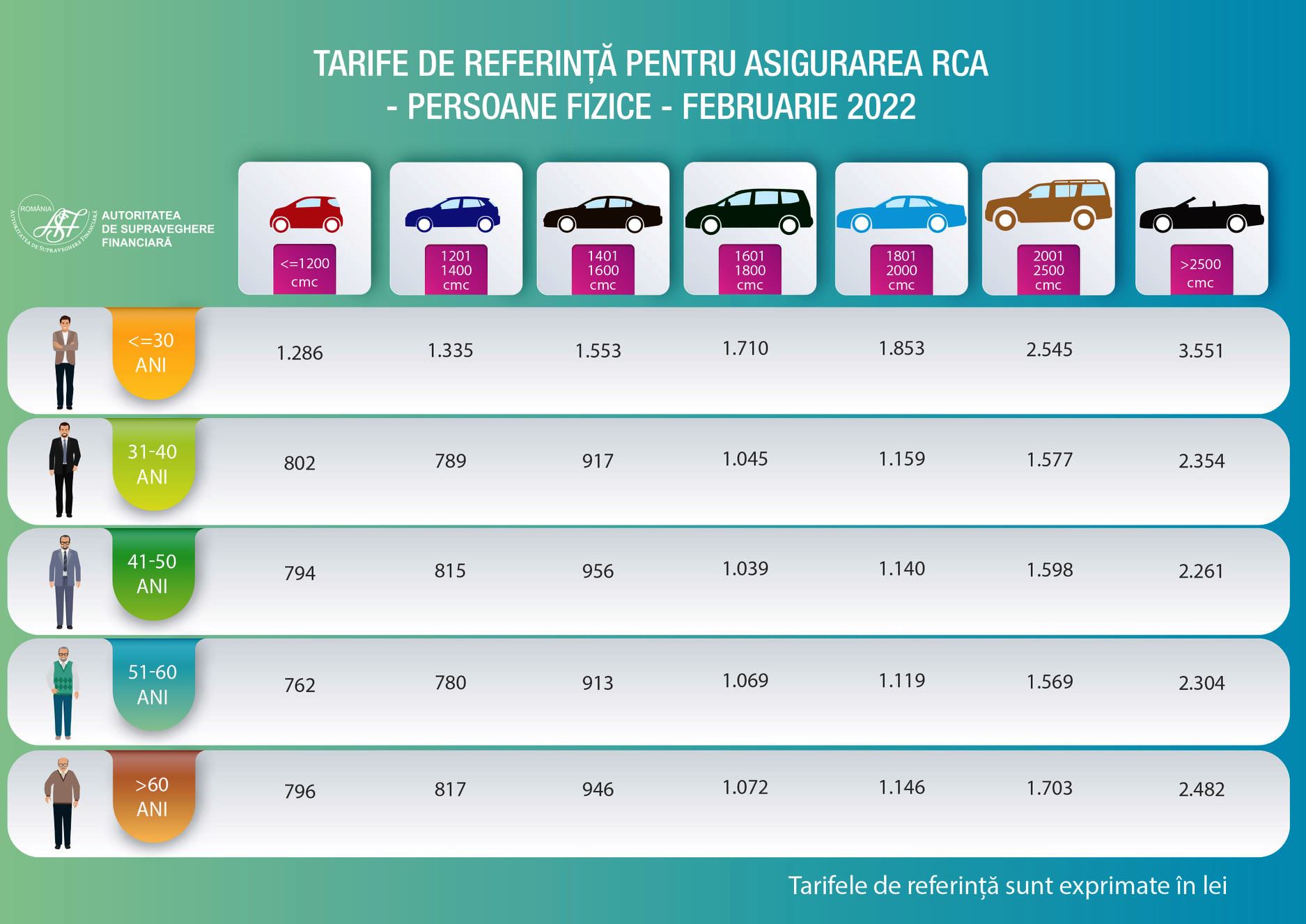 Autoritatea de Supraveghere Financiară (ASF) a dat publicității tarifele de referinţă pentru piaţa asigurărilor RCA în anul 2022. Pe baza acestora, prețurile ar urma să fie plafonate pe o perioadă de 6 luni, dar la nivelul noilor tarife de referință. Acesta va fi mai mare comparativ cu tarifele din luna august 2021 pentru toate categoriile de vârstă.