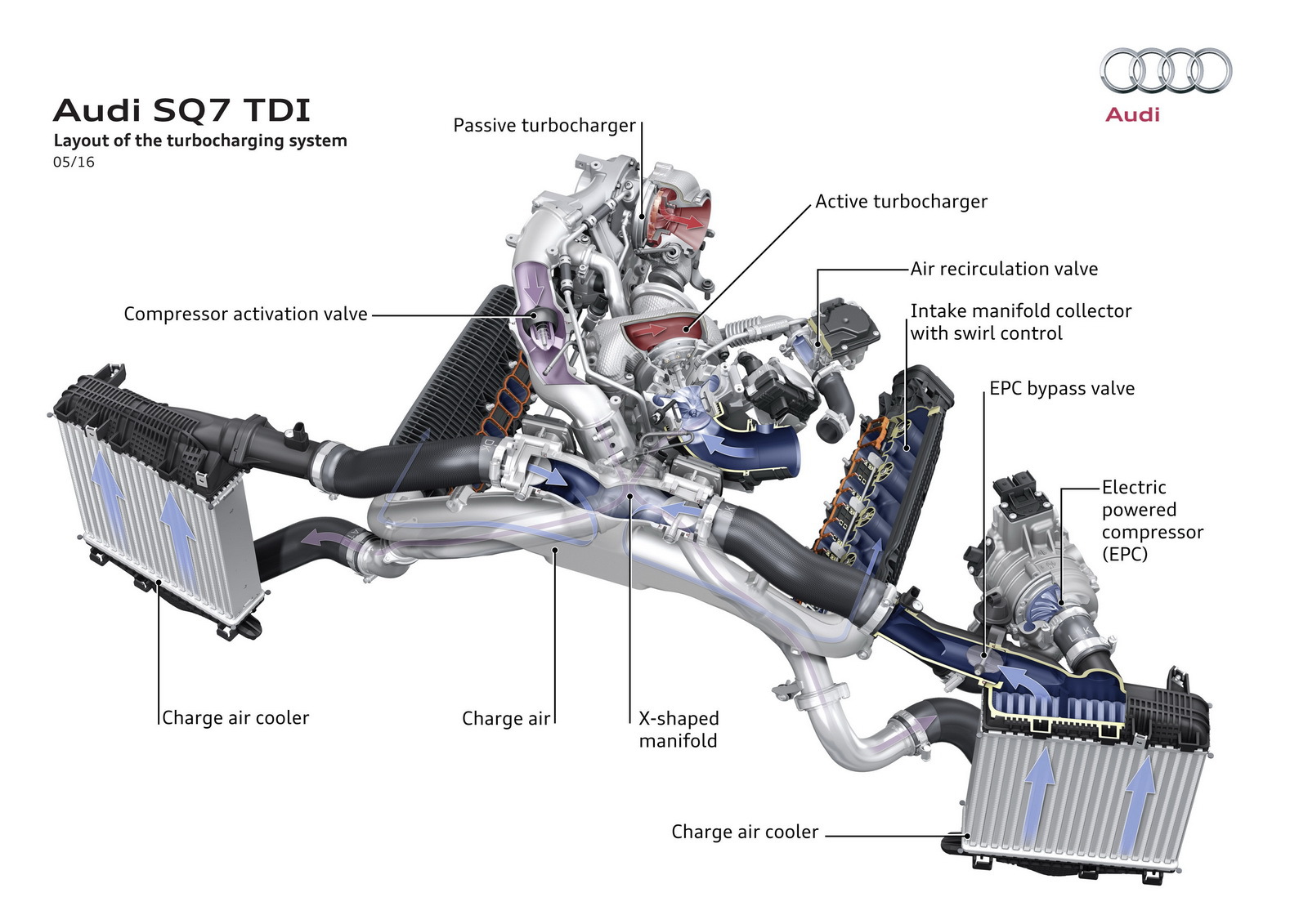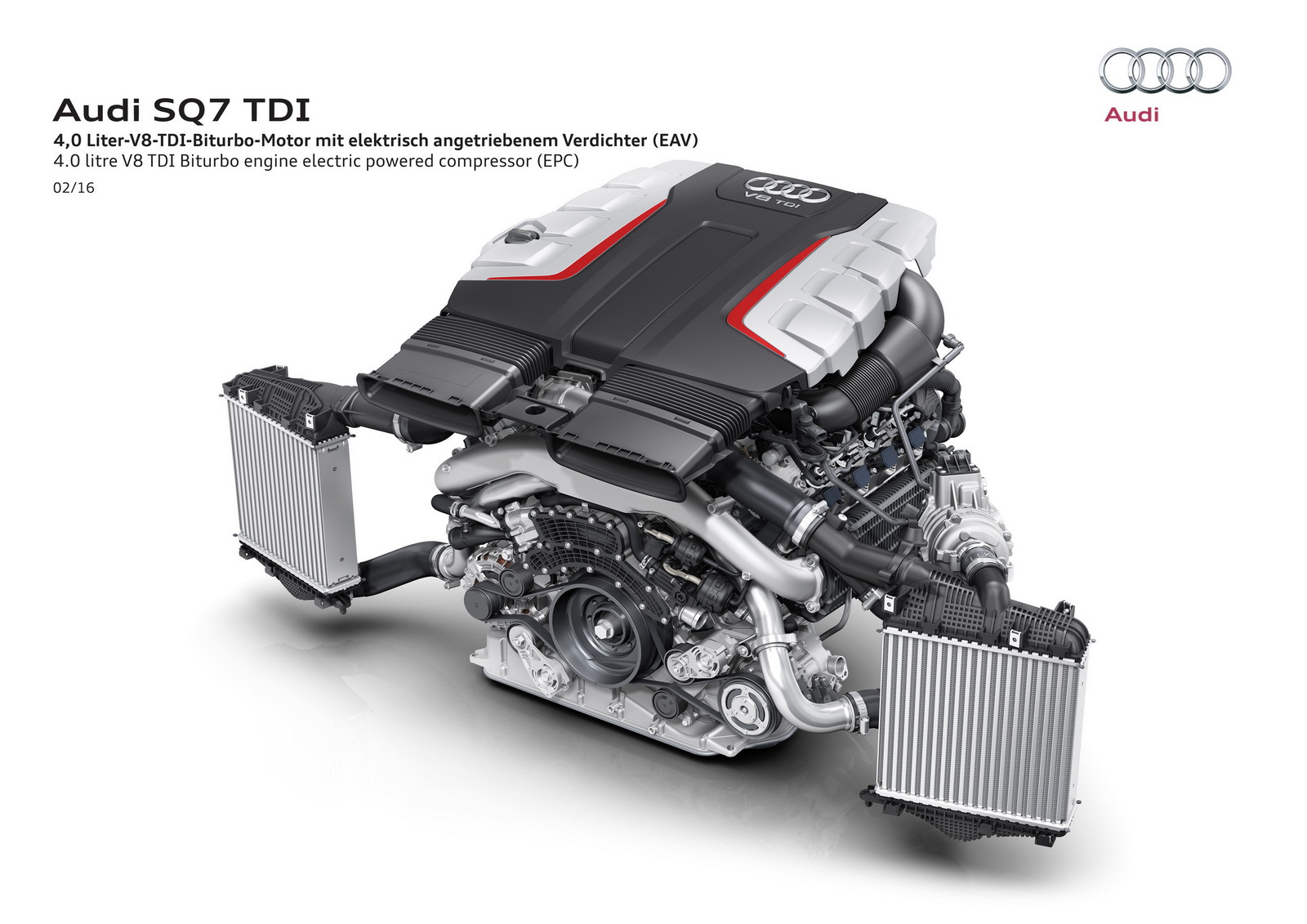 Primul motor al noii familii V8 tocmai a debutat sub capota lui SQ7 sub forma unui propulsor diesel. Dispunând de un motor avansat diesel V8 de 4.0 litri, modelul SQ7 ajunge de la zero la 100 de km/oră în doar 4.8 secunde, cu doar o zecime de secundă în spatele rivalului Range Rover Sport SVR. SQ7 vine dotat cu trei turbine, două sunt elementele obişnuite, dar a treia din ele este acţionată electric, aceasta fiind o premieră mondială pentru cei de la Audi.