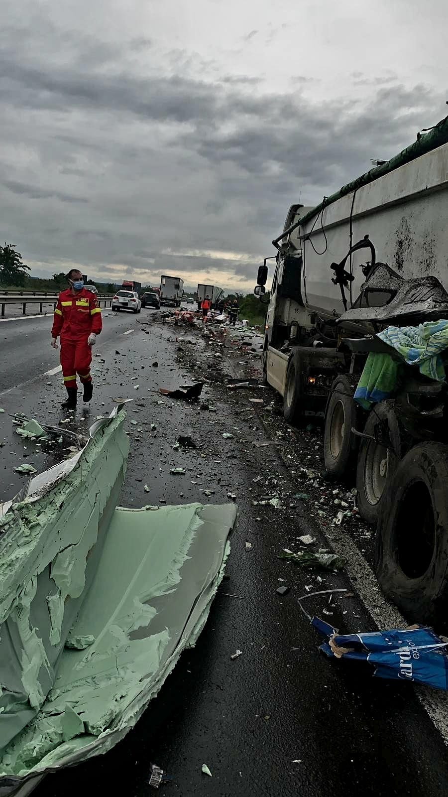 ”Accident rutier pe A 1 București – Pitești, la km 21, pe sensul de mers spre capitală. Sunt implicate două autovehicule de tonaj mare. La fața locului s-au deplasat pompierii din cadrul Detașamentului Bolintin Deal, cu două autospeciale de stingere cu apă și spumă, o ambulanță SMURD și o ambulanță SAJ.
